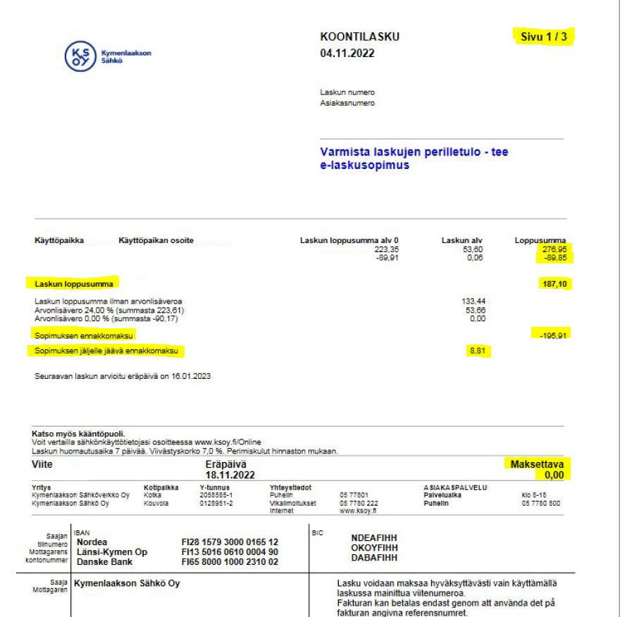 Sähkölasku sisältää paljon tietoa. Siksi teemme jatkuvaa kehitystyötä, jotta sähkölaskusi olisi mahdollisimman selkeä. Laskussasi on aina yhteenvetosivu etusivuna. Siitä selviää laskusi tärkeimmät tiedot: