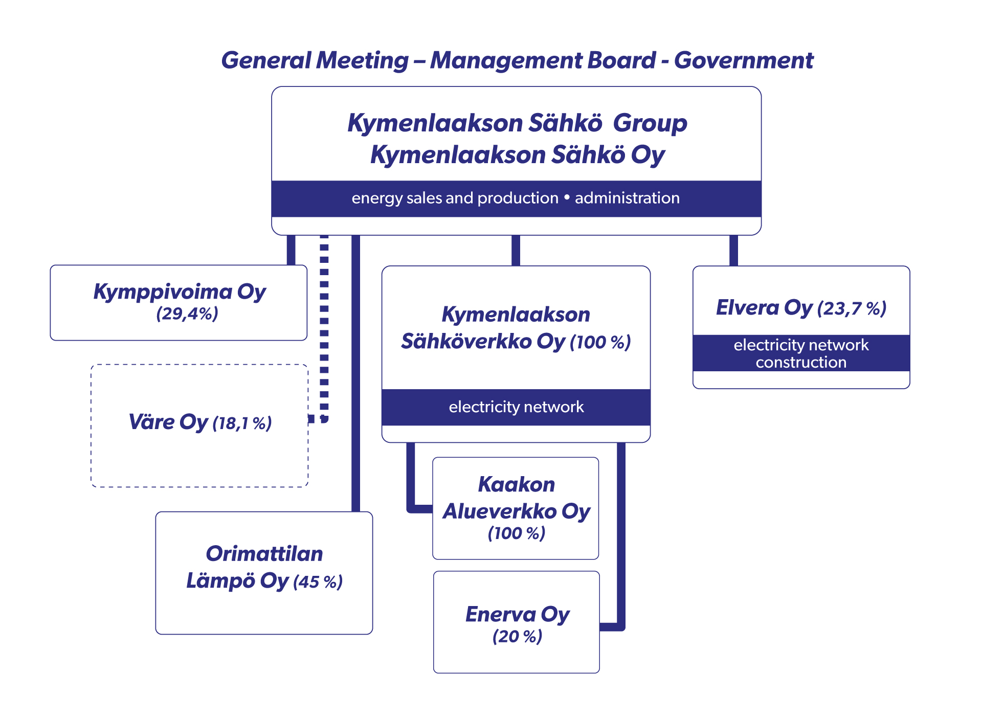 The Group consists of Kymenlaakson Sähkö Oy, responsible for the energy business, and a subsidiary in its full ownership; the distribution system operator Kymenlaakson Sähköverkko Oy. The company also has holdings in the Kymppivoima companies, Orimattilan Lämpö Oy, Elvera Oy. Kymenlaakson Sähköverkko Oy owns Kaakon Alueverkko Oy and 20 % of Enerva Oy.
