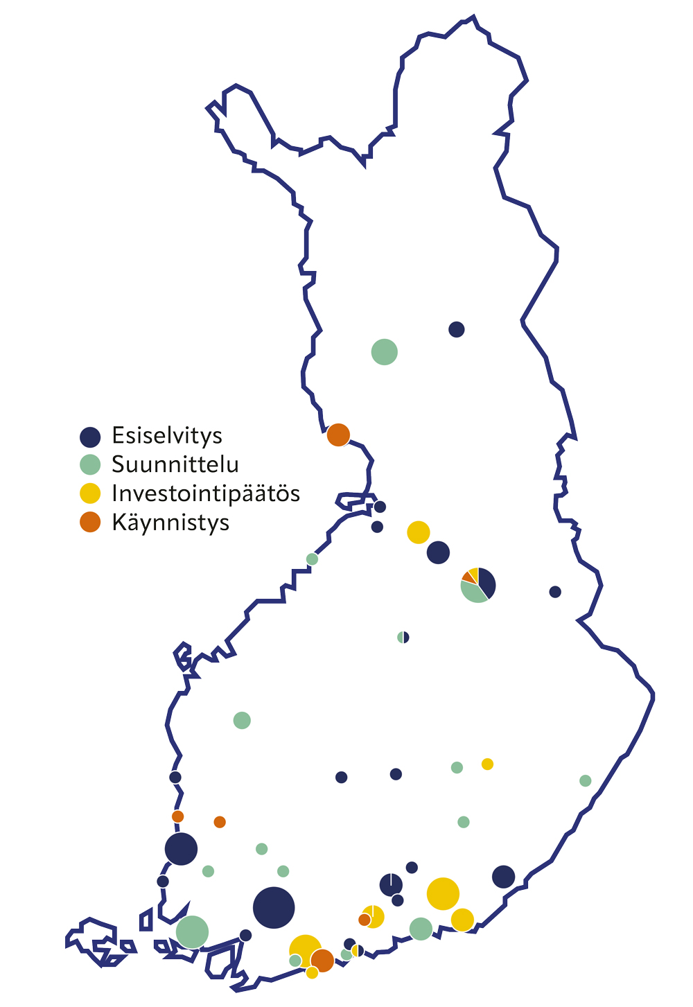 Datakeskusinvestoinnit Suomessa paikkakunnittain. Kartta on suuntaa antava. Lähde: EK 8.10.25