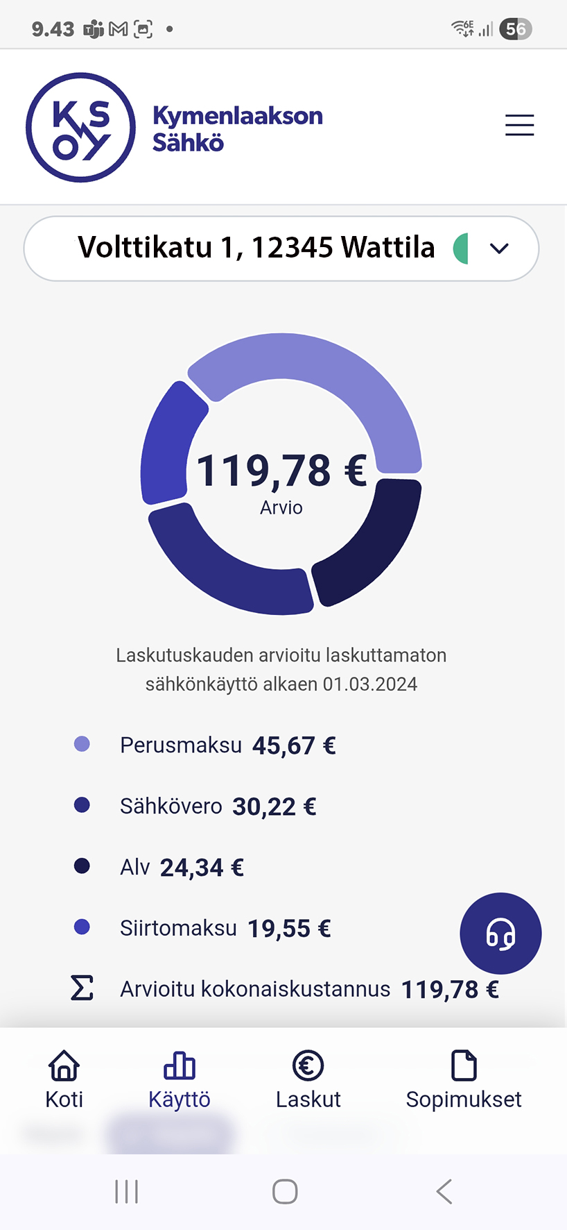 Palvelun alareunasta pääset Käyttöosioon, josta näet seu raavan laskutuskauden arvioidun sähkönkäytön ja sen mukaan arvioidun kokonaiskustannuksen. Sen suuruinen on seuraava sähkölaskusi, jos kulutus on aikaisemmalla tasolla.