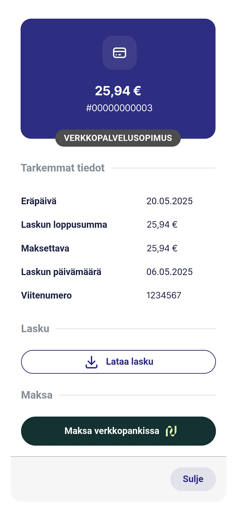 Helpoin ja kätevin tapa hoitaa sähkölaskut on e-lasku. Lasku tulee automaattisesti verkkopankkiisi, voit itse tarkastaa sen ja laittaa maksuun. Oma KSOY -palvelun mobiiliversiossa voit muuttaa laskutustavan e-laskuksi eli lähettää itsellesi e-laskuehdotuksen. Selainversiossa tämä ei ole mahdollista.