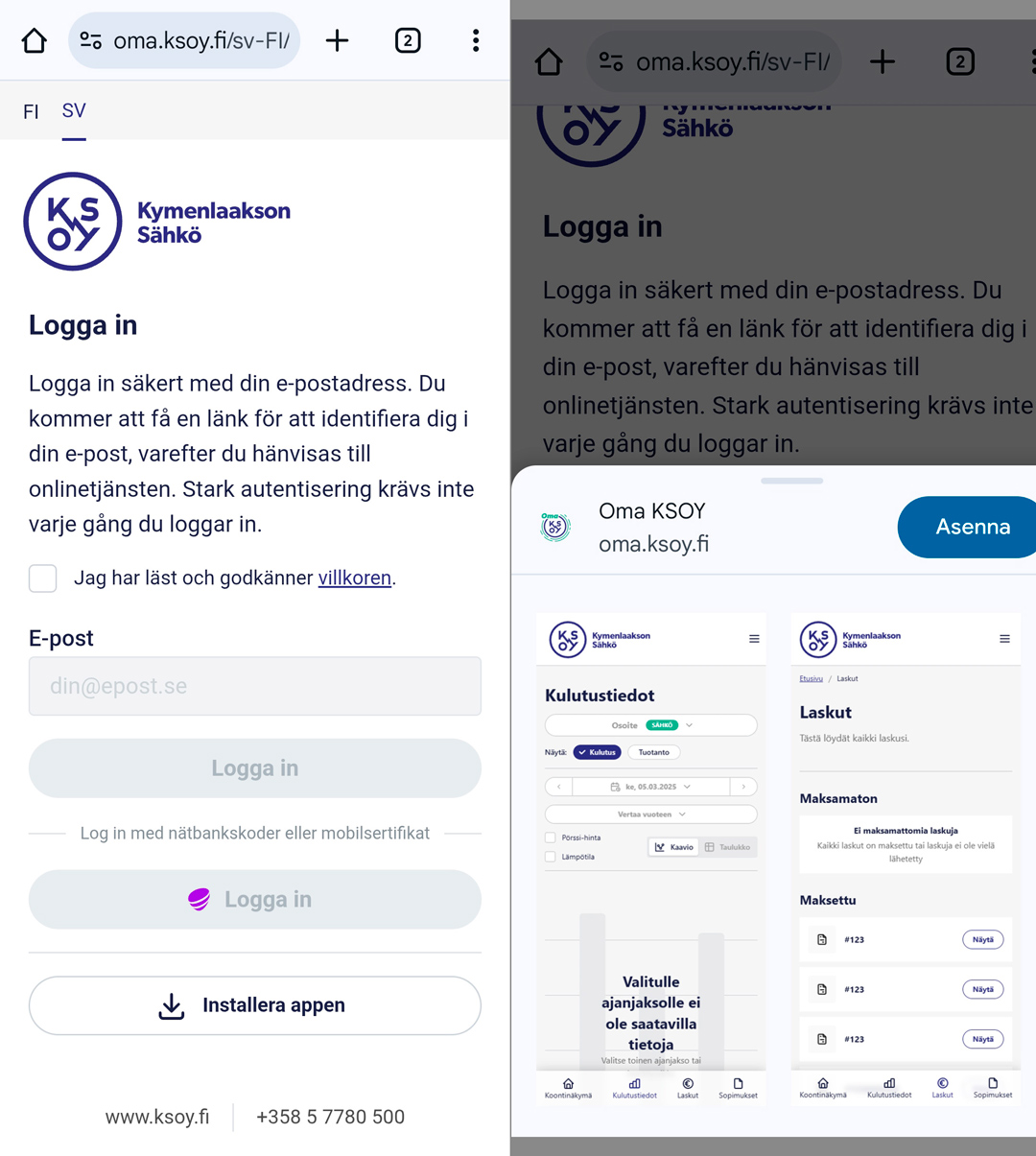 När du loggar in första gången behöver du en stark autentisering. Säkerheten kontrolleras genom autentisering ibland även senare eftersom tjänsten använder dina egna elförbrukningsuppgifter. Du kan använda tjänsten också med webbläsarversioner på din dator, men vi rekommenderar att du installerar appen i din telefon.