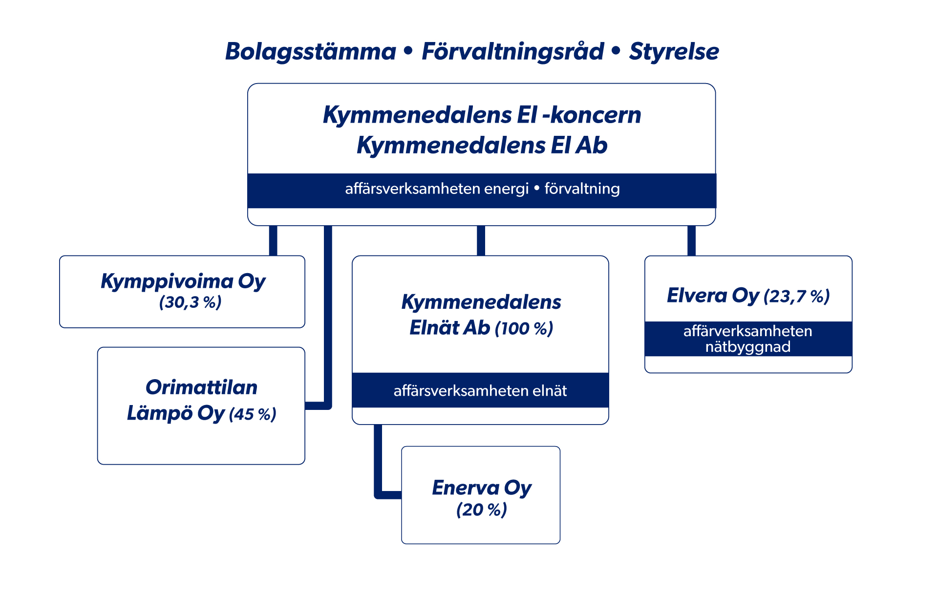 Koncernen består av Kymmenedalens El Ab som idkar energiverksamhet och dess helägda dotterbolag, Kymmenedalens Elnät Ab. Bolaget har även andelar i Kymppivoima-bolagen, i Orimattilan Lämpö Oy och i Elvera Oy. Kymmenedalens Elnät Ab äger 20 % av Enerva Oy.