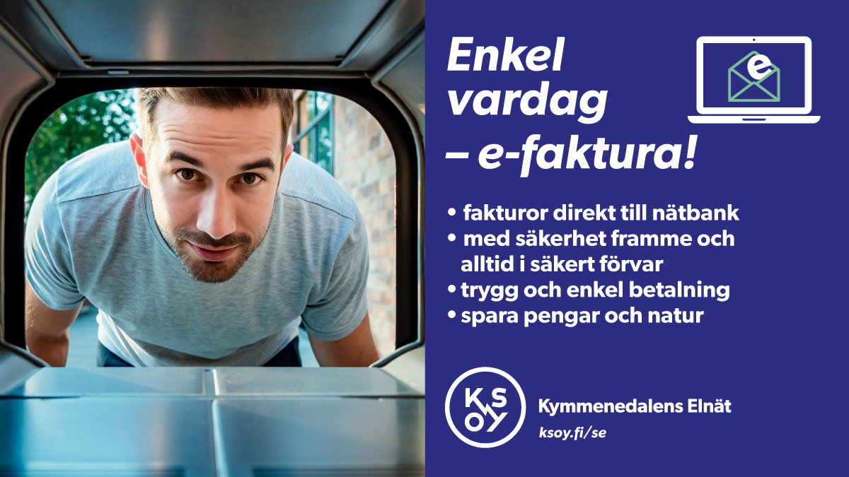 Tack vare de fjärravlästa mätarna faktureras kunderna utifrån deras faktiska elanvändning. Välj själv om du vill ha din elräkning i form av en e-räkning, e-posträkning eller en traditionell pappersräkning. Du kan även styra din elräkning till den elektroniska postlådan, OmaPosti. Adress: www.posti.fi/sv/privat/omaposti (öppnas i ett nytt fönster)