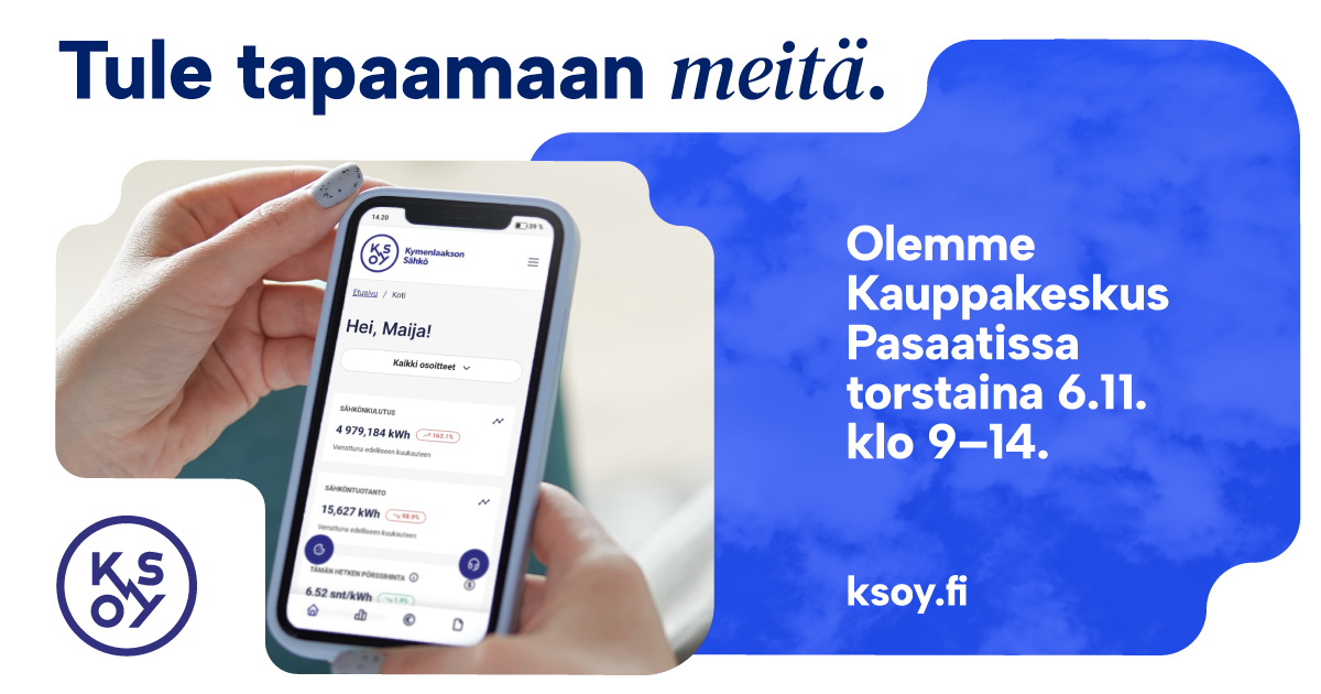 Askarruttaako Oma KSOY -palvelu tai sähkömittareiden vaihto? Tule tapamaan meitä Kauppakeskus Pasaatiin torstaina 6.11. klo 9-14.